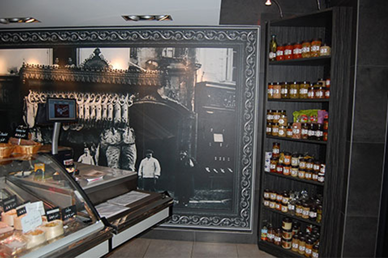 Entièrement refaite depuis quelques années, la boutique reflète pleinement leurs goûts et leur personnalité. Empreinte d’un esprit baroque clairement exposé, du lustre à pampilles au fauteuil de velours en passant par les cadres moulurés et la dominante de gris et de rouge, vous n’aurez jamais vu une boucherie - charcuterie d’une telle élégance.
